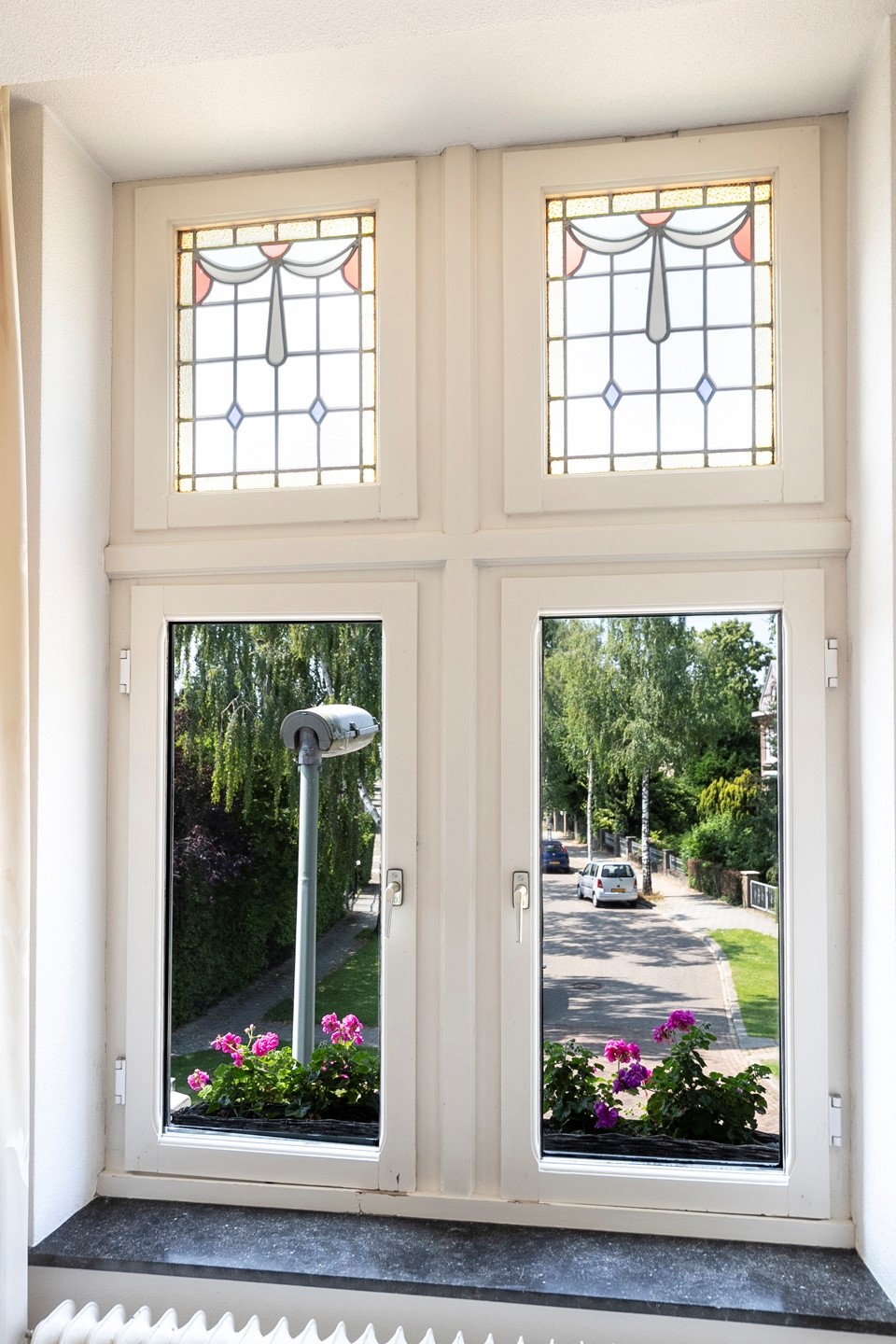 -Grotendeels houten kozijnen met dubbel glas, bovenlichten voorzien van sfeervol glas-in-lood. Aan de achterzijde op de begane grond zijn rolluiken aanwezig.