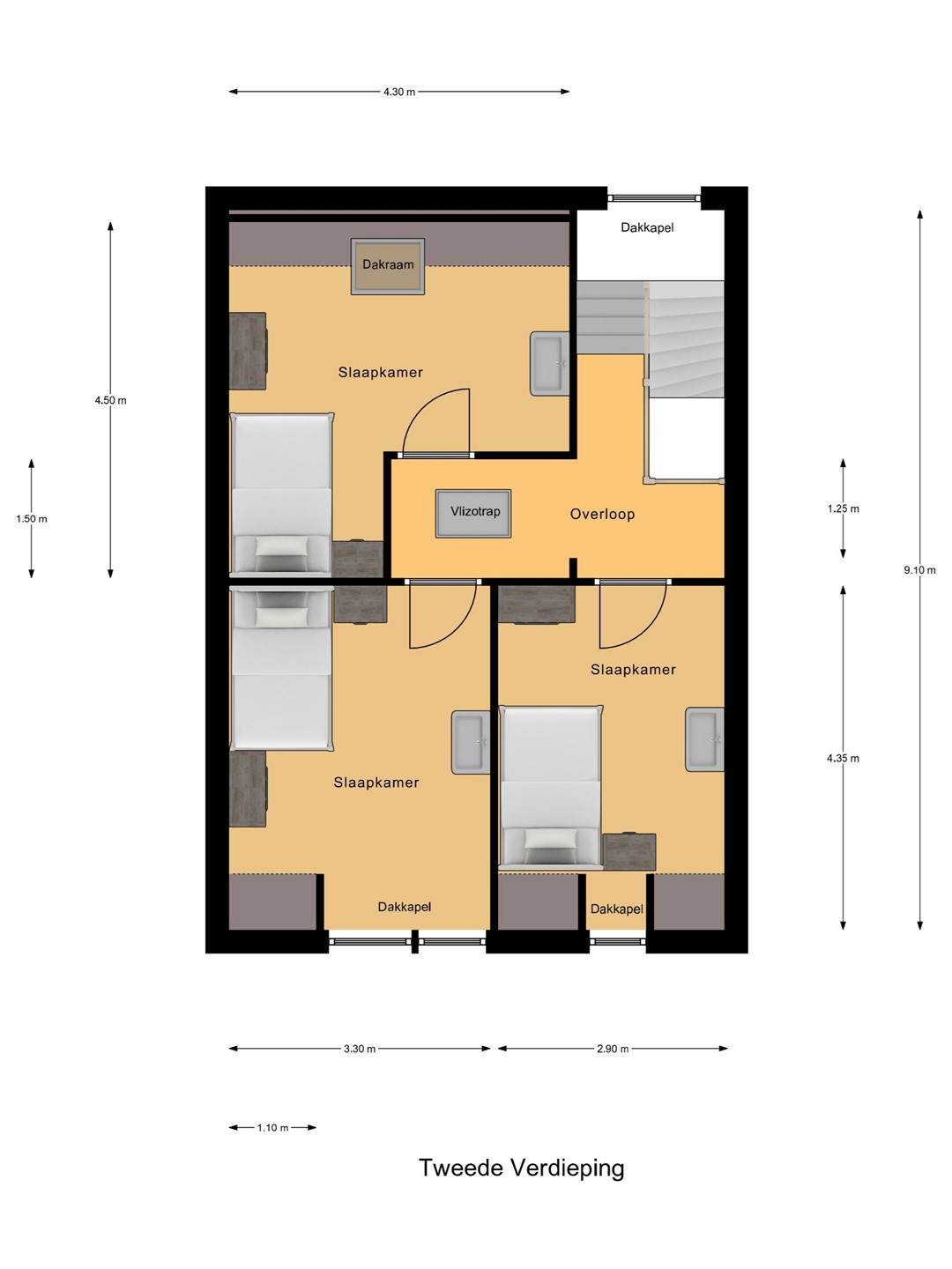 Via de bordestrap is de tweede verdieping bereikbaar. Via de overloop bereikt men 3 ruime slaapkamers. Allen voorzien van eigen wastafelmeubel. Slaapkamer 2 (ca. 13m²) voorzien van dakkapel, radiatorombouw, spots. Slaapkamer 3 (ca. 14m²) voorzien van dakkapel. Slaapkamer 4 (16m²) met dakraam. De gehele tweede verdieping is voorzien van een laminaatvloer en rookmelders.