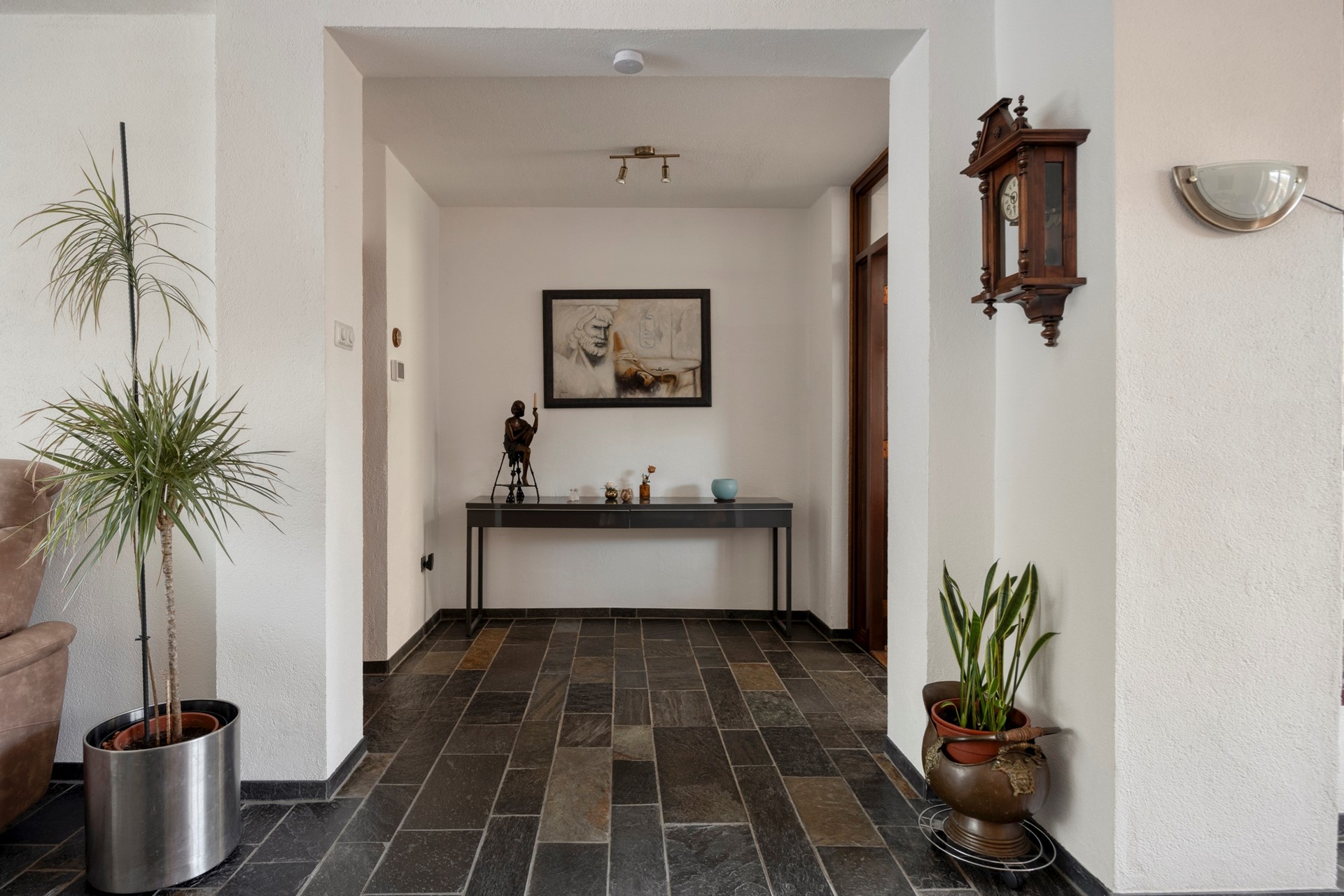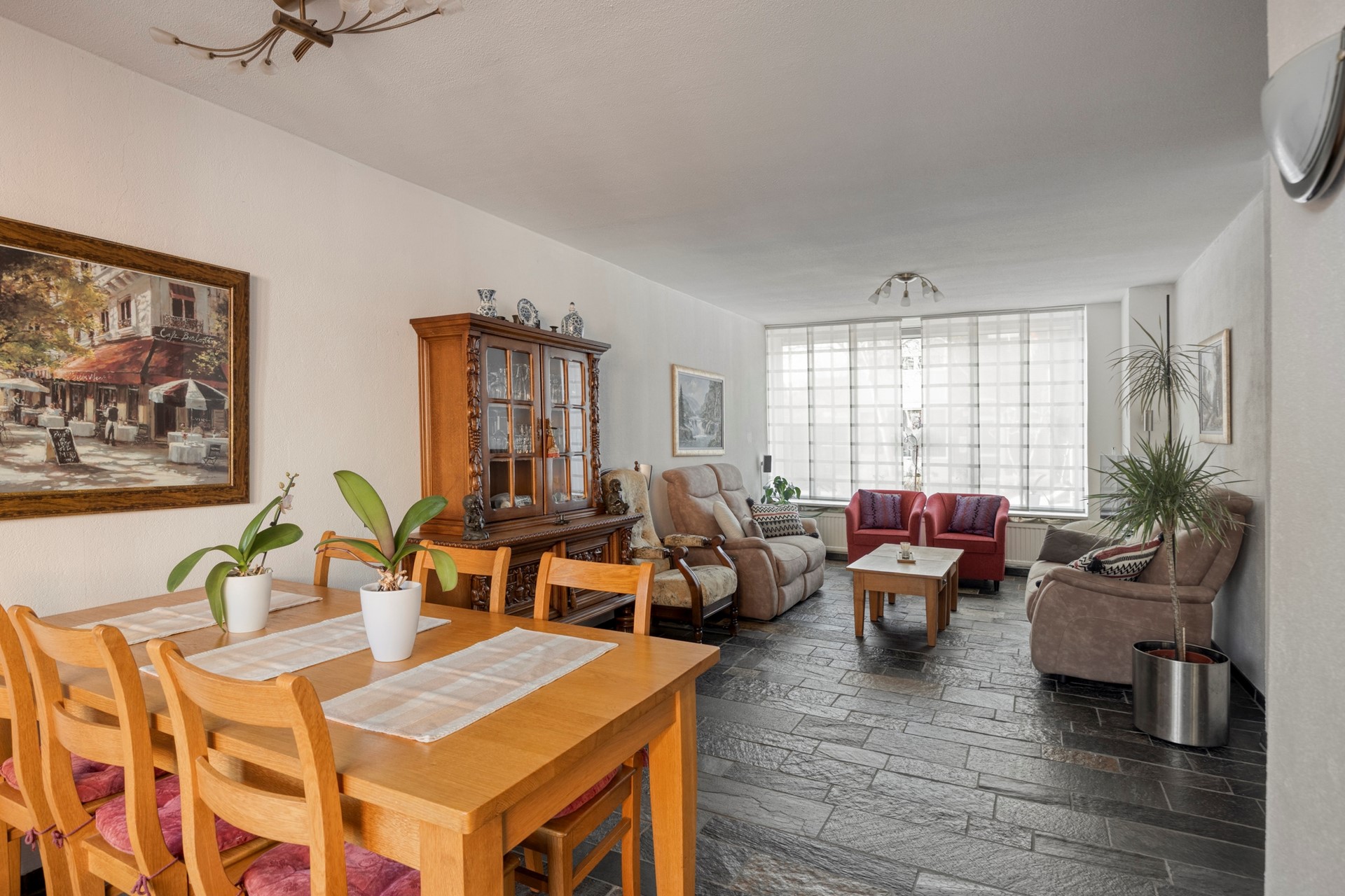 Bij binnenkomst word je verwelkomd in de hal met plavuizen vloer, meterkast, toiletruimte met wandcloset en fonteintje, en een stijlvolle wenteltrap naar de verdiepingen. Vanuit hier stap je de lichte T-vormige woonkamer binnen, voorzien van een leistenen vloer en grote raampartijen die zorgen voor een prettige hoeveelheid daglicht. De ruimte biedt moeiteloos plaats aan een royale eethoek én een gezellige zithoek.