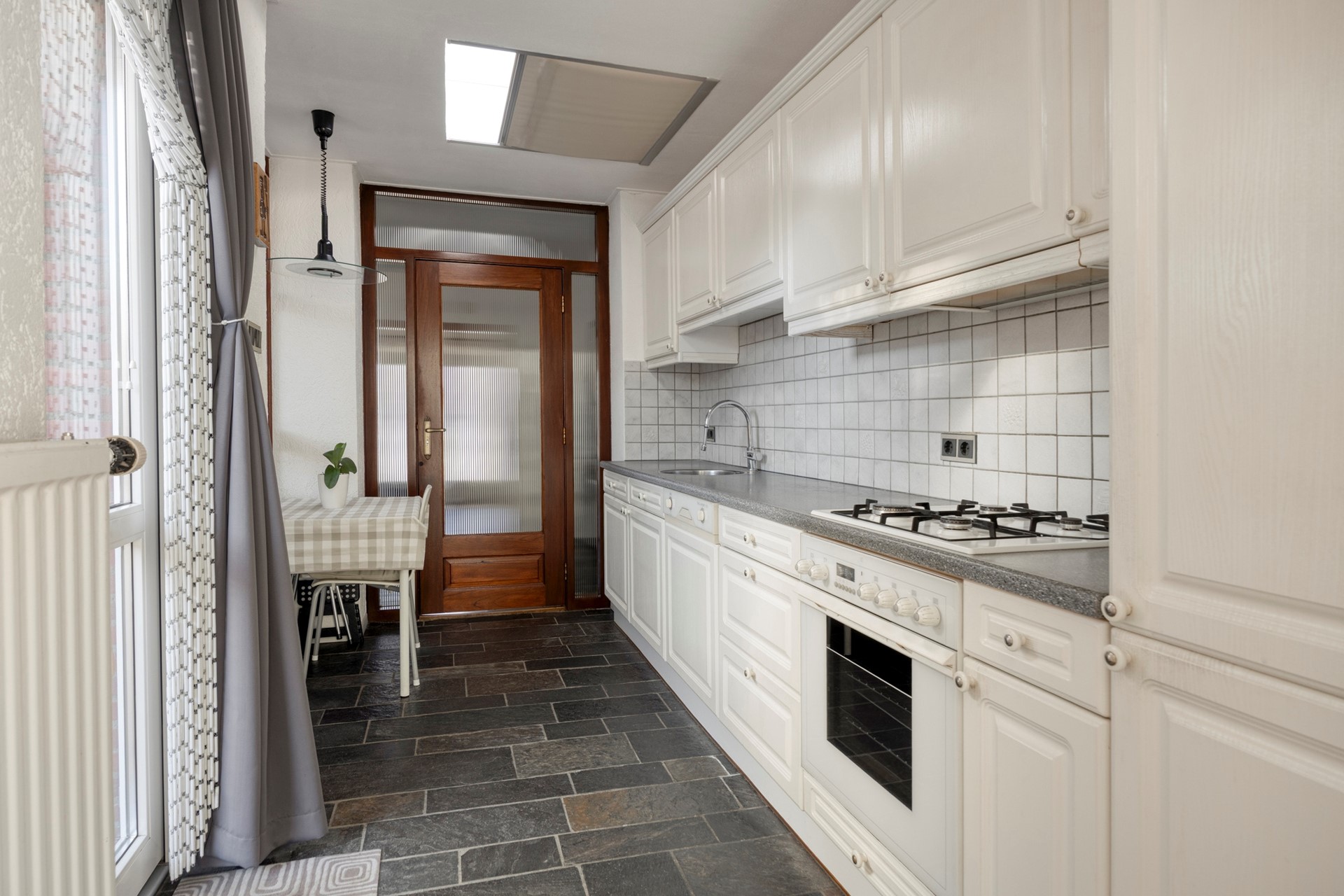 De keuken is praktisch ingedeeld en van alle gemakken voorzien: een 4-pits gasfornuis, oven, koelkast, vaatwasser en afzuigkap. Dankzij de lichtkoepel geniet je hier van extra daglicht. Via de achterdeur bereik je direct de royale achtertuin. Aansluitend bevindt zich de praktische bijkeuken, ideaal voor witgoed en extra bergruimte.